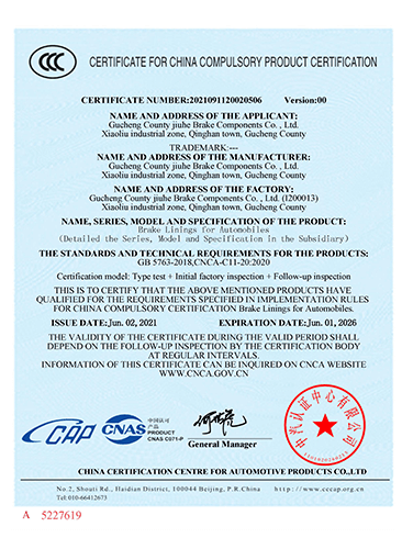 故城縣九和制動(dòng)元件有限公司主導(dǎo)產(chǎn)品為:汽車剎車片、裝載機(jī)剎車片。剎車片采用高溫高壓的熱壓工藝、設(shè)備、生產(chǎn)線、能保證質(zhì)量穩(wěn)定,有為主機(jī)廠配套生產(chǎn)的經(jīng)驗(yàn)和能力。劉如根商標(biāo)是公司主要商標(biāo),公司還有飛人標(biāo)牌、蛟龍牌、橫空出世等品牌!公司有多個(gè)剎車片檢驗(yàn)設(shè)備,剎車片摩擦性能定速摩擦試驗(yàn)機(jī)與國(guó)家非金屬礦制品檢驗(yàn)中心試驗(yàn)機(jī)是同公司生產(chǎn)的同型號(hào)試驗(yàn)機(jī)。拖曳試驗(yàn)機(jī)2020年通過(guò)中國(guó)建材檢驗(yàn)集團(tuán)咸陽(yáng)有限公司檢驗(yàn)合格,剪切試驗(yàn)機(jī);布氏和洛氏試驗(yàn)機(jī)。2021年公司通過(guò)國(guó)家強(qiáng)制性CCC認(rèn)證、通過(guò)過(guò)19001-2000idt ISO 9001:2015質(zhì)量體系認(rèn)證,IATF16949認(rèn)證,歐盟Emark認(rèn)證。剎車片執(zhí)行GB/T11834-2011、GB 5763-2018標(biāo)準(zhǔn)。公司產(chǎn)品先后曾給山東臨工、徐工、卡特彼勒(山工)、徐州美馳車橋公司、肥城金城橋公司,山東路通橋箱科技公司,山東博士樂(lè)公司,郯城郯液公司,日照金···